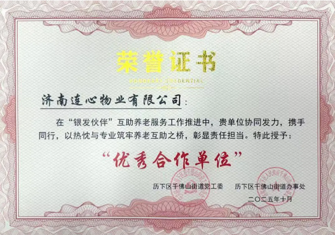 此次獲評(píng)“優(yōu)秀合作單位”是對(duì)濟(jì)南連心物業(yè)社會(huì)責(zé)任擔(dān)當(dāng)與務(wù)實(shí)精神的高度認(rèn)可。作為“銀發(fā)伙伴”項(xiàng)目的重要參與力量,連心物業(yè)充分發(fā)揮服務(wù)專(zhuān)業(yè)的優(yōu)勢(shì),積極整合資源、搭建互助平臺(tái)、組織為老活動(dòng),切實(shí)筑牢社區(qū)養(yǎng)老互助橋梁,助力該模式持續(xù)走深走實(shí),推動(dòng)養(yǎng)老事業(yè)與產(chǎn)業(yè)協(xié)同發(fā)展。