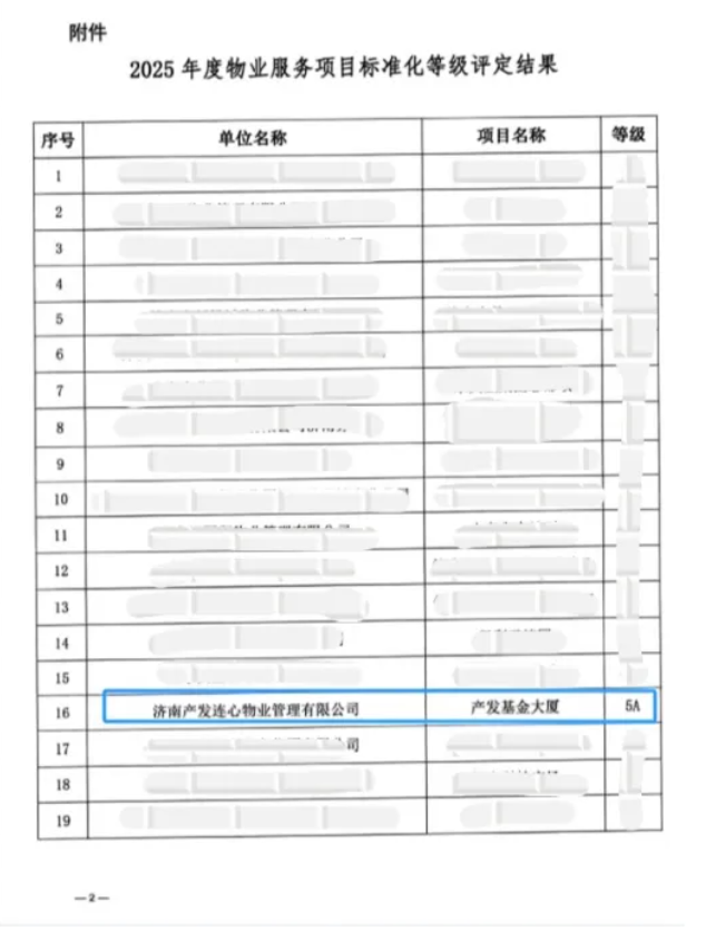 11月4日,濟南市物業(yè)管理行業(yè)協(xié)會公布2025年度物業(yè)服務(wù)項目標準化等級評定結(jié)果,濟南連心物業(yè)有限公司服務(wù)的趵突泉釀酒有限責任公司項目獲評4A等級,濟南產(chǎn)發(fā)連心物業(yè)管理有限公司服務(wù)的產(chǎn)發(fā)基金大廈項目獲評5A等級。