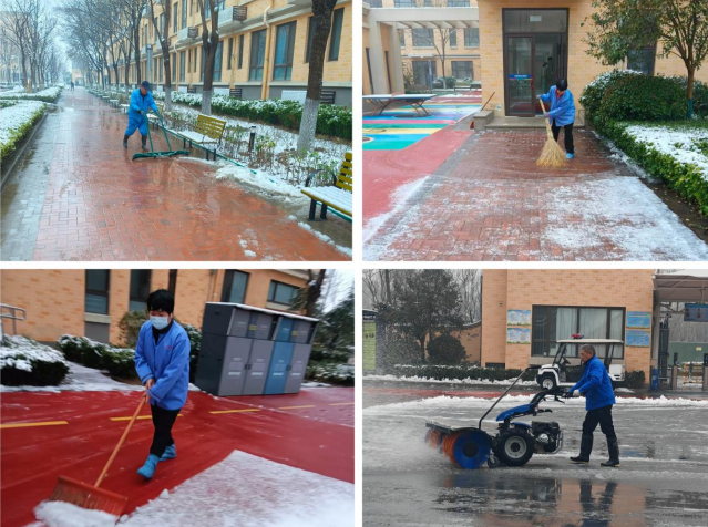 安全放首位。“一定要在師生返校前將主要道路、教學(xué)樓出入口等重點區(qū)域清理干凈。”項目經(jīng)理現(xiàn)場指揮,物業(yè)人員對人員密集場所出入口進行重點清掃,并及時鋪設(shè)防滑墊,嚴防師生滑倒。秉持“用心去做,快樂服務(wù)”的宗旨,大家頂風(fēng)冒雪、連續(xù)奮戰(zhàn),手上磨出水泡也無人退縮。