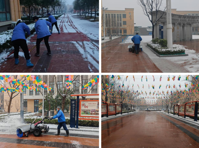 雪情即命令。清晨天剛蒙蒙亮,物業(yè)員工已手持工具奮戰(zhàn)在清雪一線。大家不畏嚴寒、分工協(xié)作,有的揮舞掃帚清掃路面積雪,有的手持推雪板清理主干道,還有的操作掃雪機高效推進。在大家共同努力下,原本被積雪覆蓋的校園道路逐漸露出原貌。