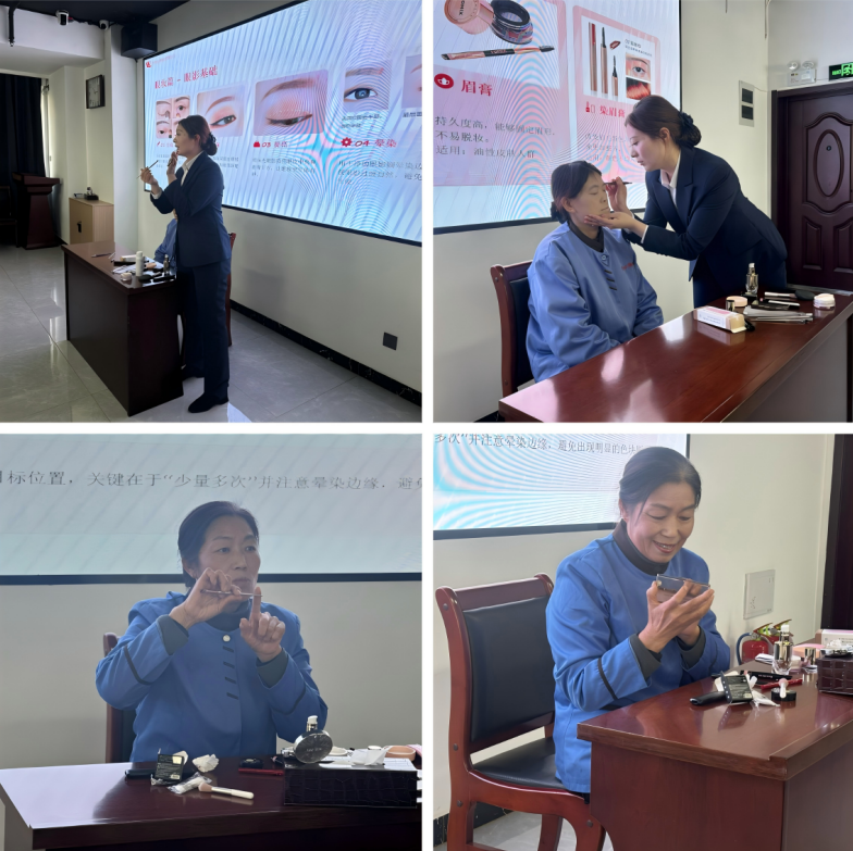 本次活動聚焦女職工最為關(guān)注的“外在形象”與“內(nèi)在修養(yǎng)”兩大主題,講師圍繞職業(yè)化妝技巧、個人形象管理以及職場禮儀禮貌規(guī)范等內(nèi)容進(jìn)行系統(tǒng)講解?;瘖y與形象管理環(huán)節(jié),講師從日常護(hù)膚入手,詳細(xì)講解職場淡妝的畫法、色彩搭配以及如何根據(jù)個人膚色、臉型選擇適合的妝容與著裝風(fēng)格。通過現(xiàn)場演示,直觀展示妝容變化帶來的精氣神提升,強(qiáng)調(diào)良好的職業(yè)形象不僅是個人魅力的展現(xiàn),更是企業(yè)對外展示的一張名片。